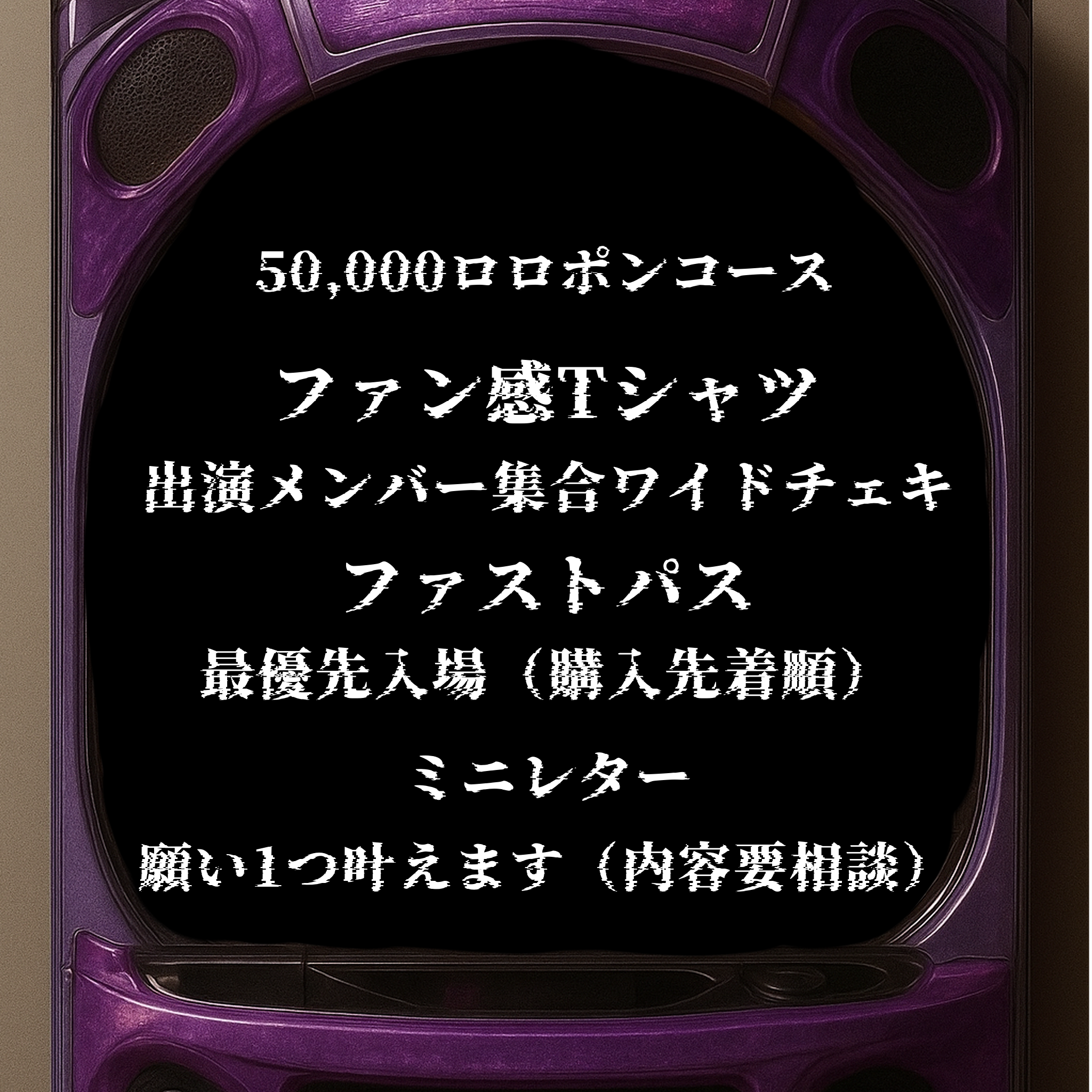 50,000円 出演メンバー全員集合ワイドチェキ+ファストパス(出演メンバー1人のみに使用可・1回限り)+ファン感Tシャツ・メンバー集合ワイドチェキ・ファストパス・優先入場(整理番号先着順)+ミニレター+1つお願い叶えます(内容要相談)