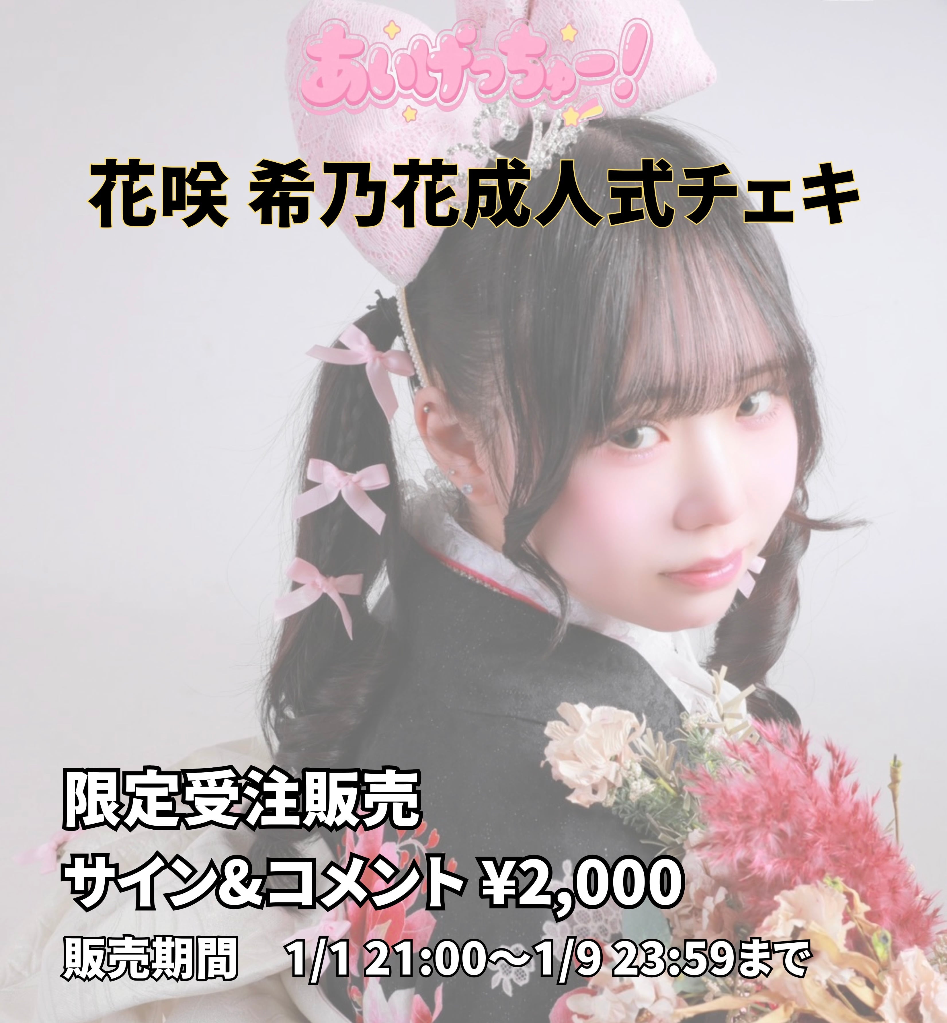 今年成人式を迎えるあいげっちゅー!メンバー「花咲 希乃花」の振袖ソロチェキを通販限定で販売決定!