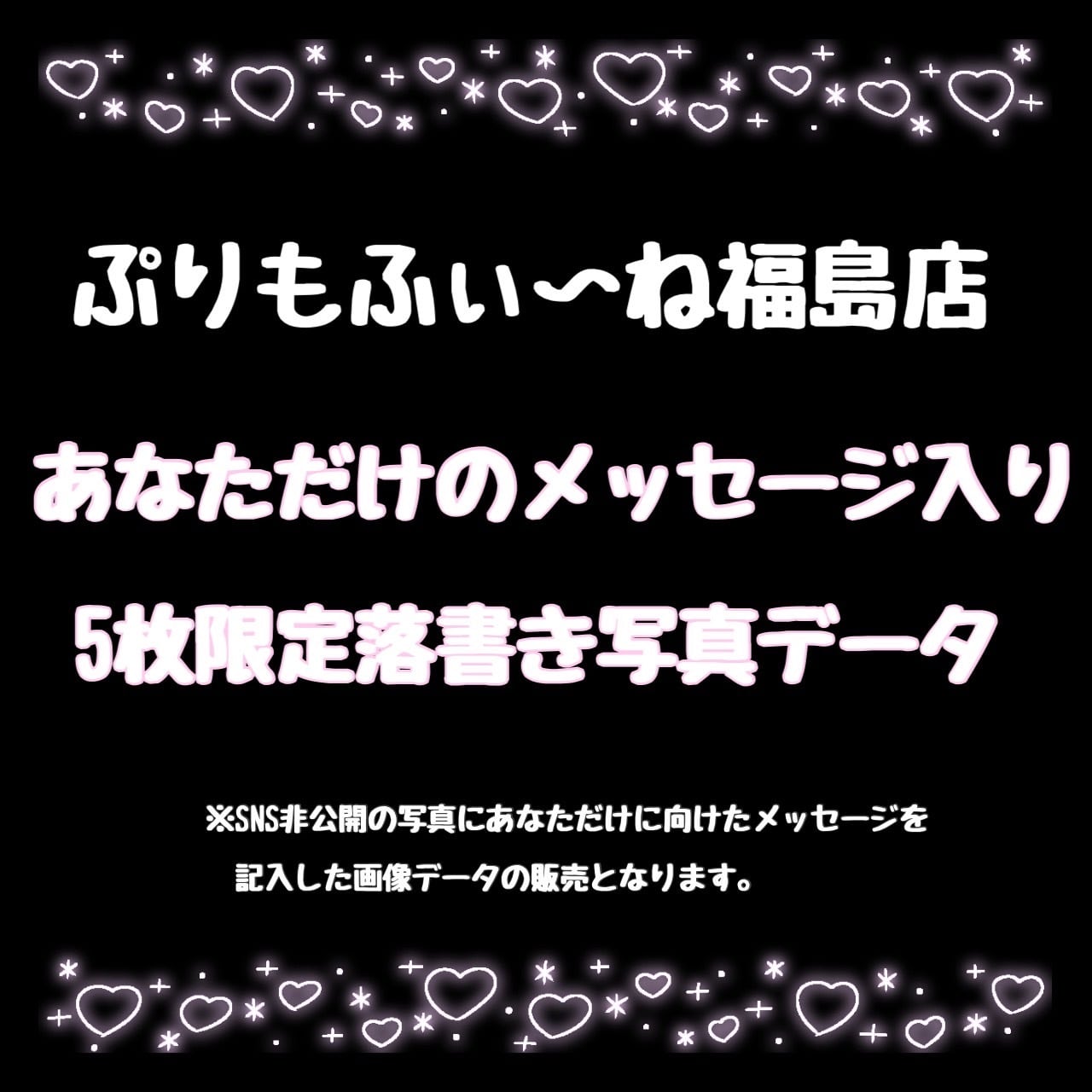 ぷりもふぃ〜ね福島店の所属のメイドちゃん1名につき5枚のみ限定販売のメッセージ落書き付きの写真データ販売となります。